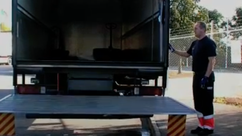 Gör en visuell kontroll av arbetsområdet runt bakgavellyften innan lyften fälls ned. Fäll bakgavellyften. Ställ dig på lyften och åk upp till flaket. Öppna luckan på lastbilsskåpet. Frigör pallyftaren och kör ut pall till bakgavellyften. Sänk pallyftaren så att pallen står direkt på lyften. Sänk bakgavellyften/åk ned med bakgavellyften till marknivå och kör av pallyftaren på trottoaren.